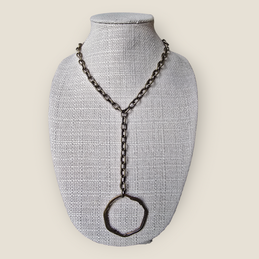 Wood Fossil Stone Lariat / Gunmetal Chain and Connectors