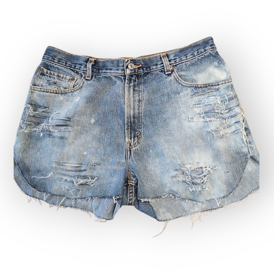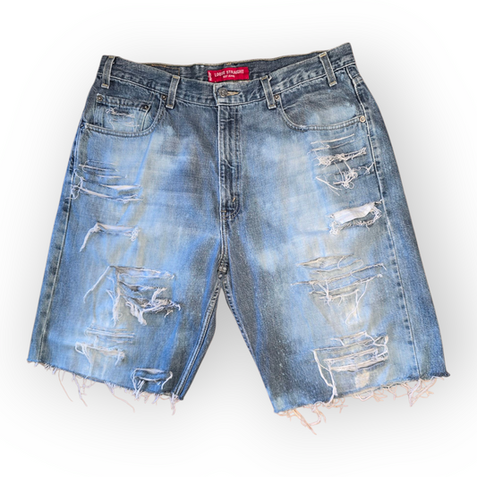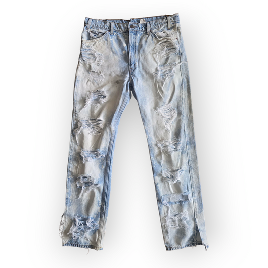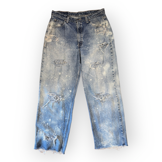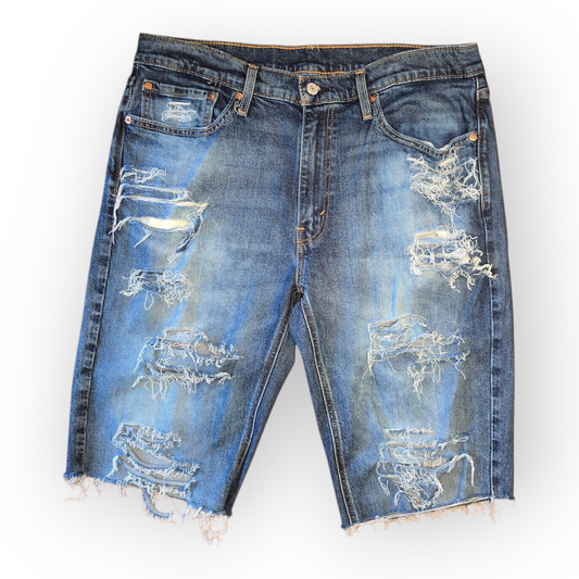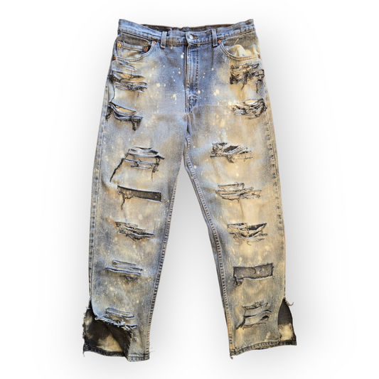 Size: Women 12 / Men 36 Fit: Regular Fit Brand: Levis 505 Stretch: No Stretch Features: Intentionally weathered (distressed...