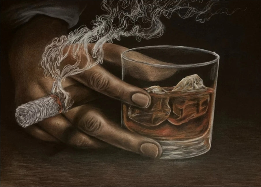 Rendered in exquisite detail, this piece breathes sophistication, from the rich amber tones of the whiskey to the hypnotic curl of cigar smoke dissipating into the darkness. The textured realism of the hand, the gleam of the glass, and the melting ice tell a story of experience, patience, and presence. Every highlight and shadow is meticulously placed, making the scene feel almost cinematic—like a frame from a noir film, frozen in time.
