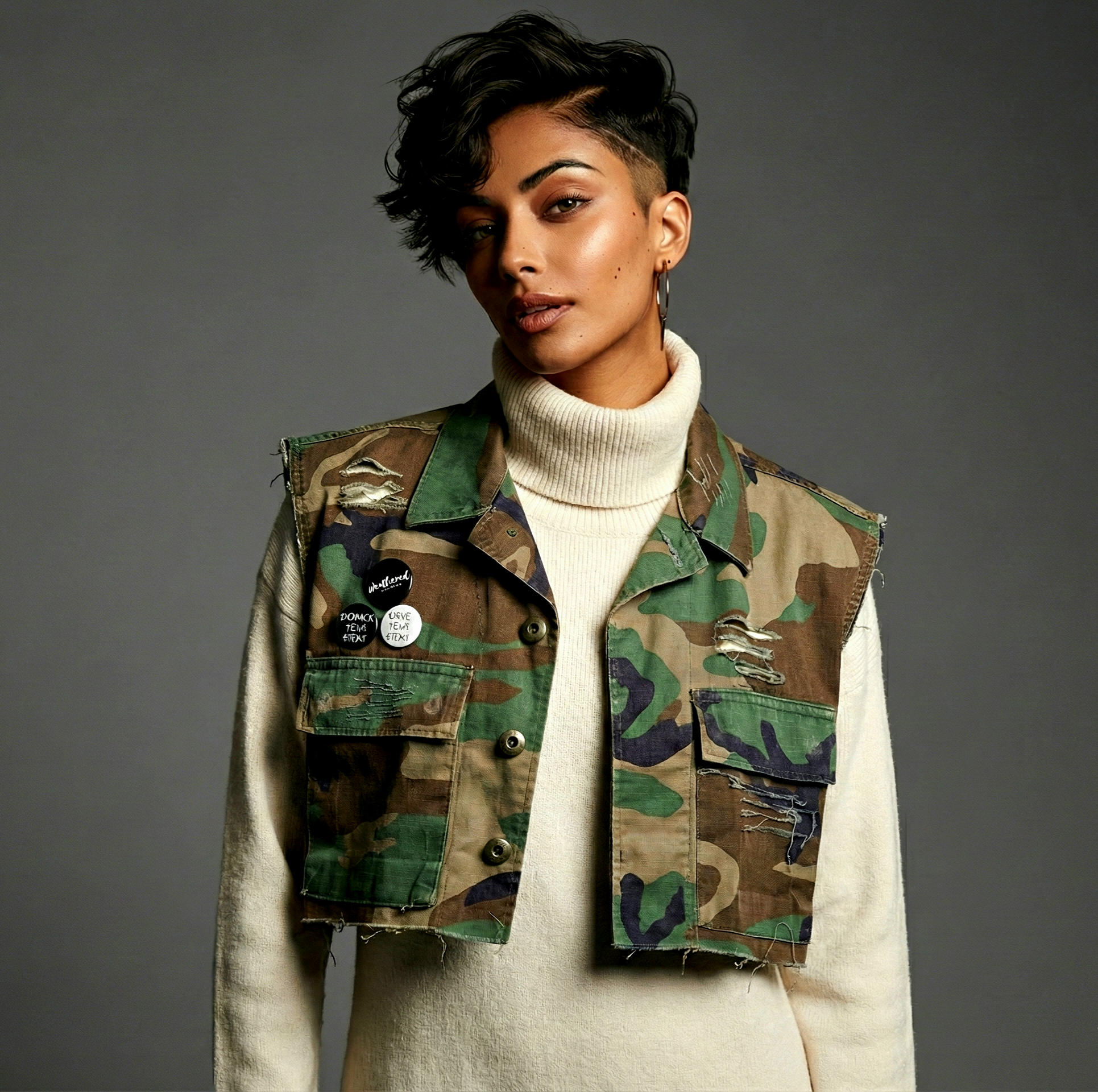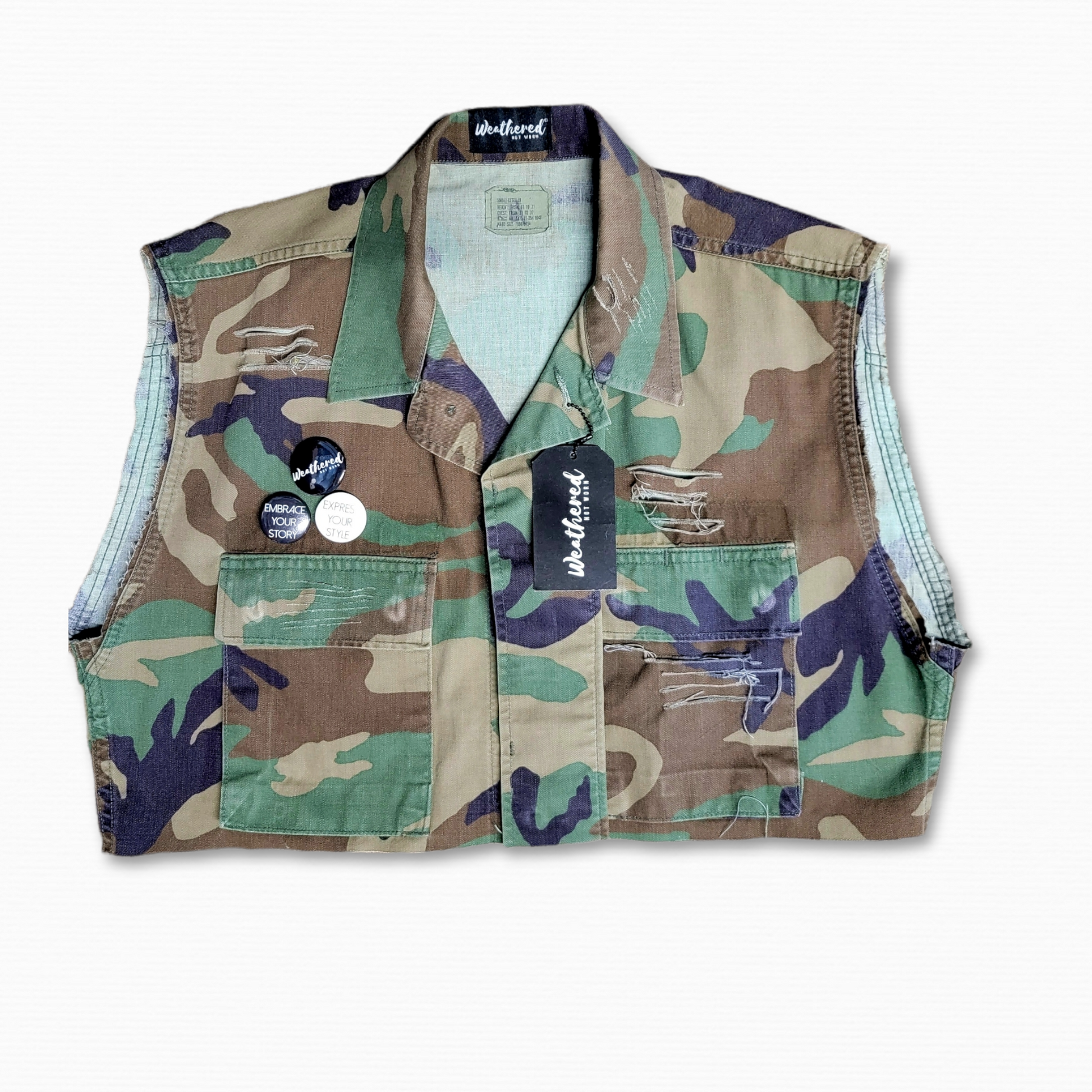 Bring a bold, one-of-a-kind vibe to your wardrobe with this cropped camo vest made from authentic military fatigues. Each piece is uniquely weathered, telling its own story of strength and resilience. Some may feature original patches or insignias from their past life in service, while others come clean—equally powerful in their simplicity. No two are the same. WNW buttons included for a signature finish.