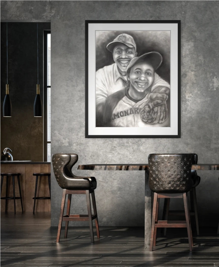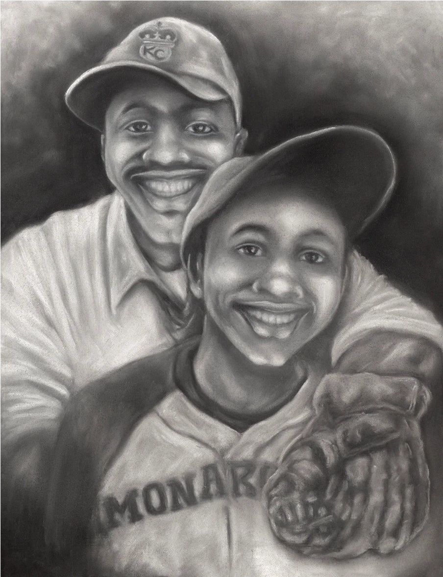 “Past Times” immediately strikes a chord with its warm portrayal of a father and son sharing a joyful baseball moment. The father, in a cap bearing the Kansas City Monarchs logo, grins proudly as he drapes an arm around his son, who wears a Monarchs jersey...both faces beam with genuine happiness, and the closeness between them is palpable. This heartwarming scene, rendered in soft greys and deep blacks, radiates nostalgia – as if we’re looking at a cherished old photograph of a special day. The title itself – Past Times – evokes a play on “pastime” (baseball as the national pastime) and moments of the past, setting a reflective, sentimental tone. Even without knowing the backstory, the artwork’s emotional narrative is clear: it celebrates familial love and the simple joy of a shared game, inviting the viewer into an intimate, universal story of father-son bonding.