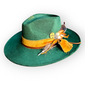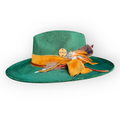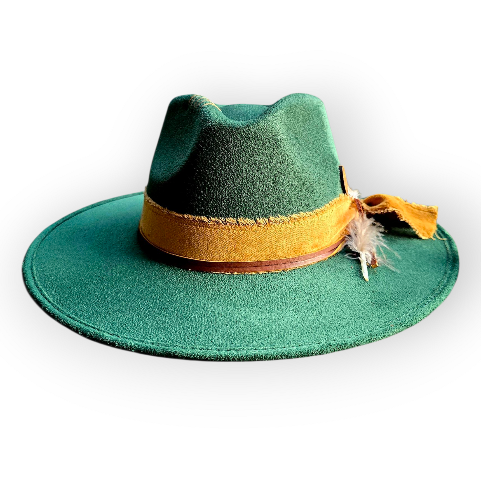 Prosper is a crown that speaks abundance into existence. The deep emerald green symbolizes growth and renewal, while the golden velvet band radiates warmth and confidence. Finished with layered feathers in earthy tones and marked with our Weathered Not Worn insignia, this piece balances elegance with authenticity.