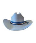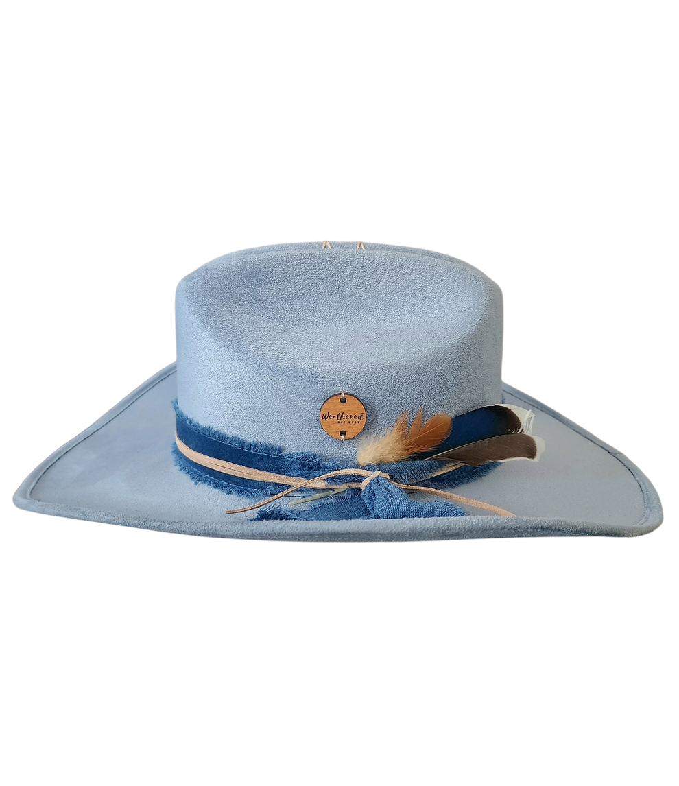 Soar is the freedom to rise above challenges and embrace new horizons. The "Soar" cowboy hat, crafted from light blue vegan suede, captures the spirit of limitless possibilities. Its bold yet graceful design is accented by a braided band, decorative feathers, and the signature WNW button, creating a look that’s both adventurous and refined.