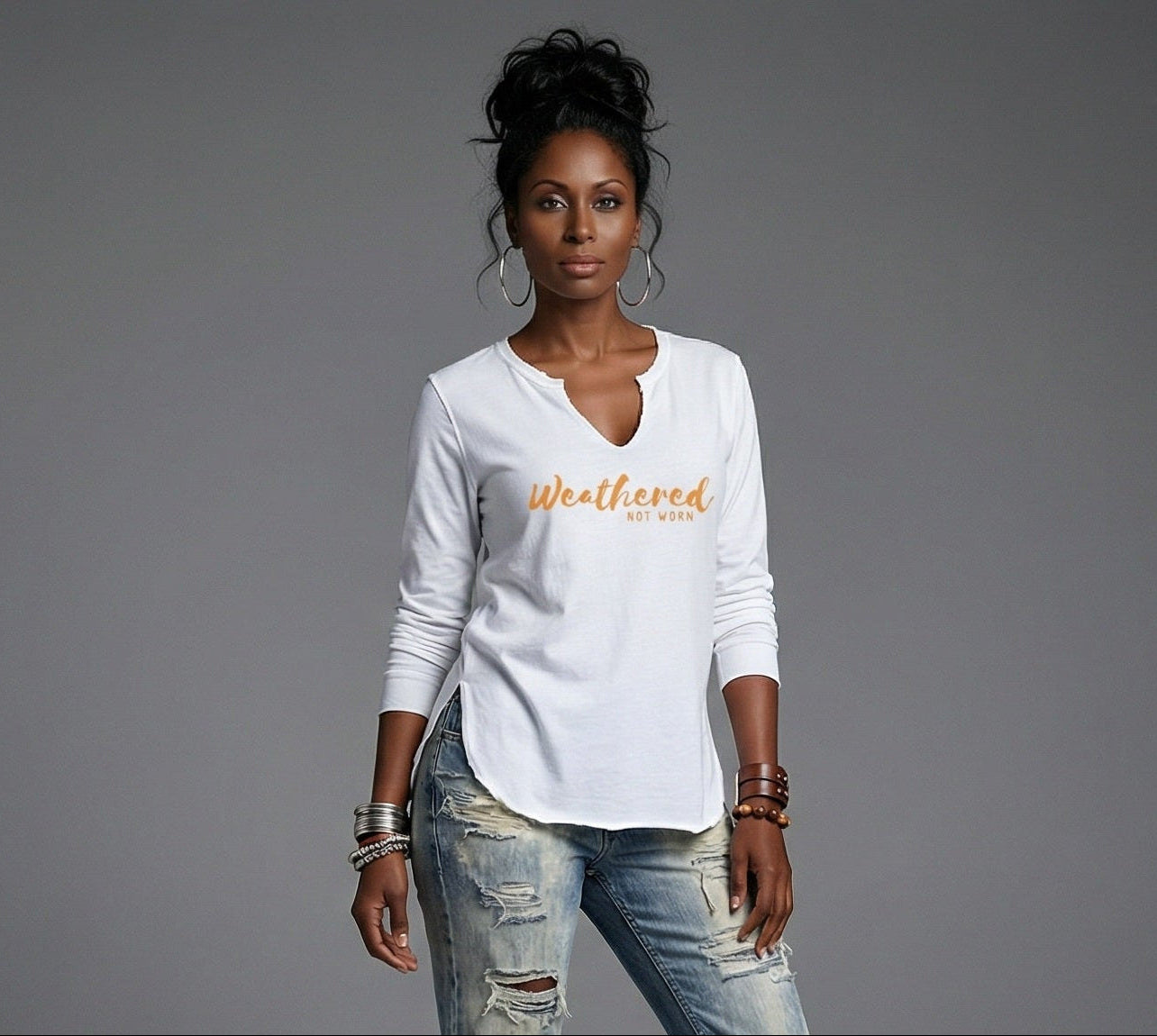The Carefree Long Sleeve introduces a looser drape and styling flexibility. Complete with our signature V-cut neckline, raw curved hem, and side slits, It moves naturally with the body and adapts to how you choose to wear it.