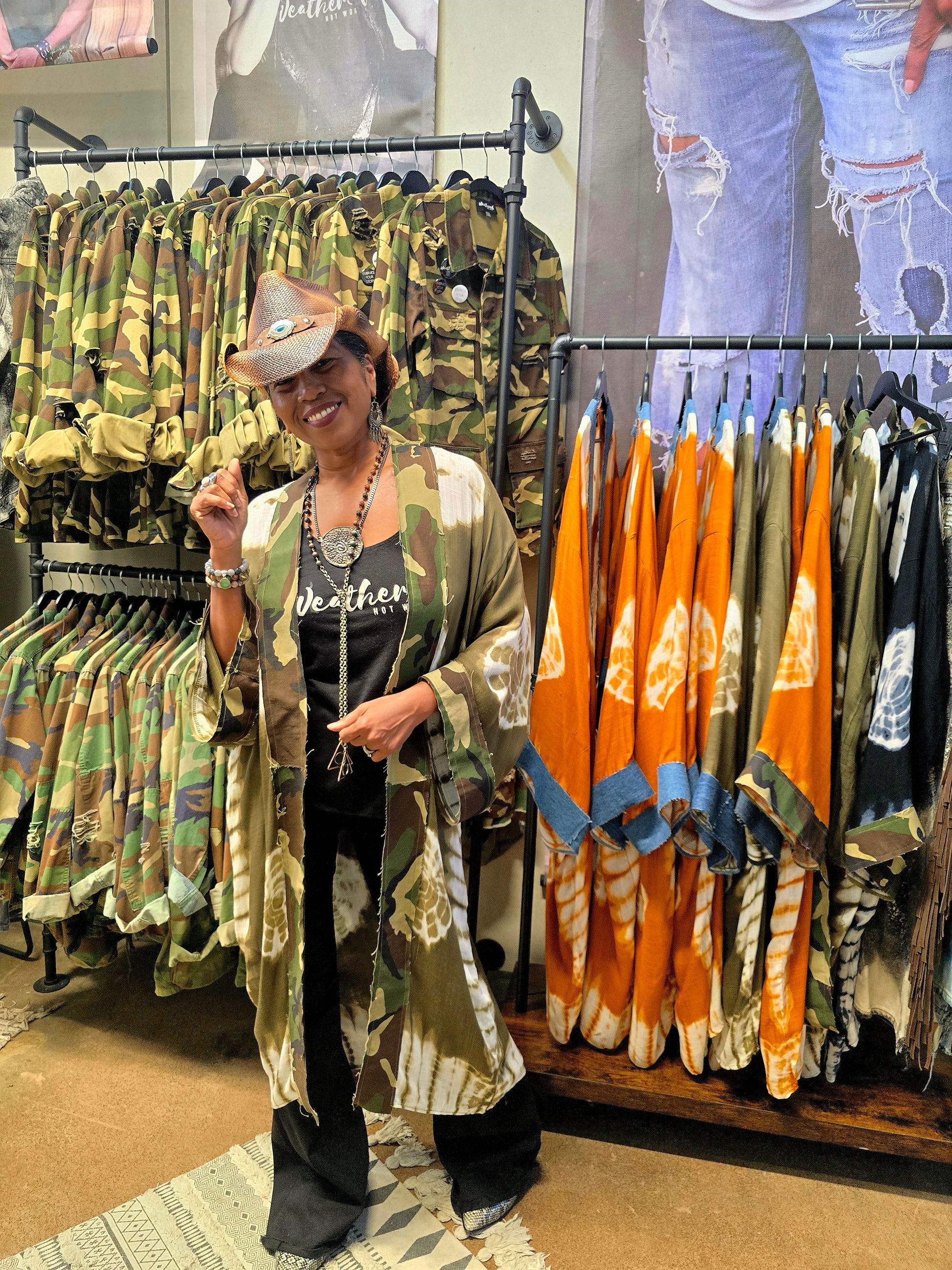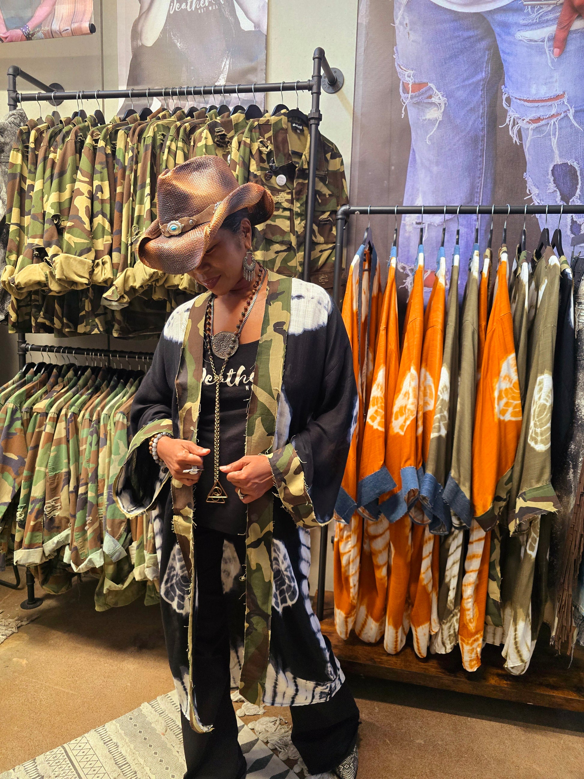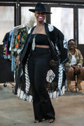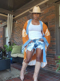 This beautiful kimono is definitely a fashion piece to add to your wardrobe. It is embellished with upcycled fabric and can be thrown on over any of your casual looks!