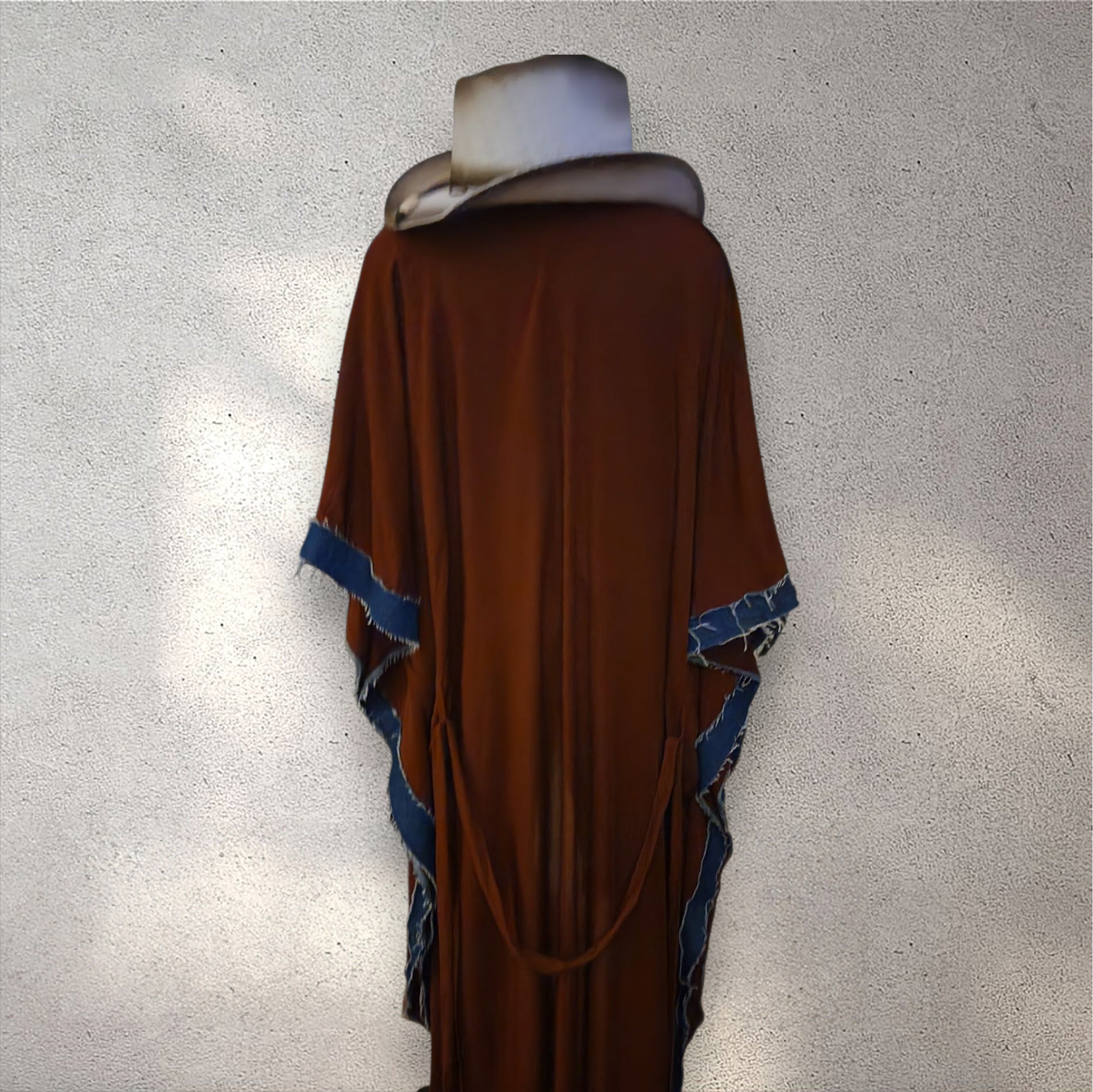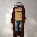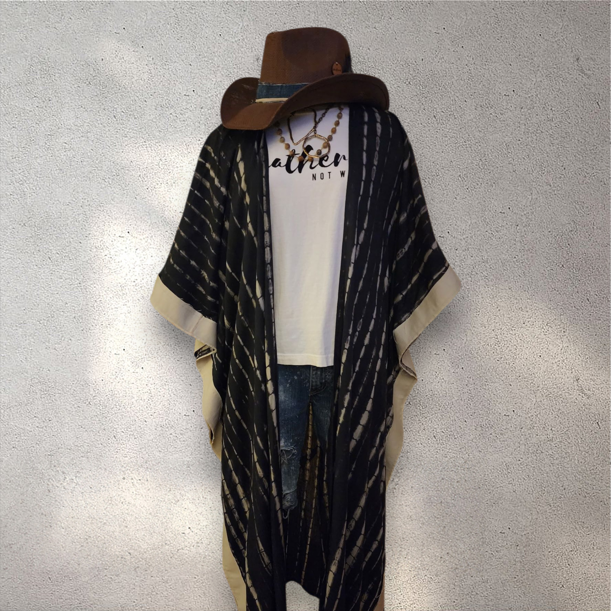 This beautiful kimono is definitely a fashion piece to add to your wardrobe. It is embellished with upcycled fabric and can be thrown on over any of your casual looks!