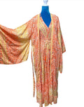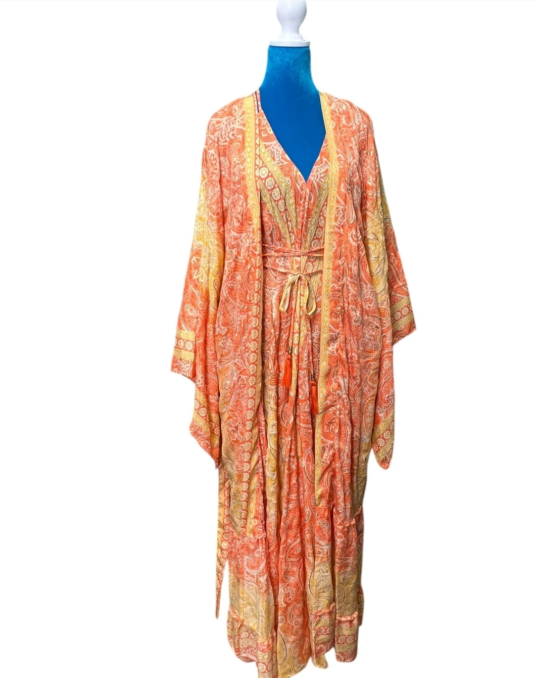 Ignite your wardrobe with the Sunset Spice Kimono Dress, a vibrant fusion of bold beauty and bohemian soul. This show-stopping piece features a warm palette of spicy orange, golden saffron, and soft ivory in an intricate paisley and mandala-inspired print. With its flowy fit, voluminous sleeves, and cinchable waist, it flatters effortlessly while radiating fierce feminine energy.