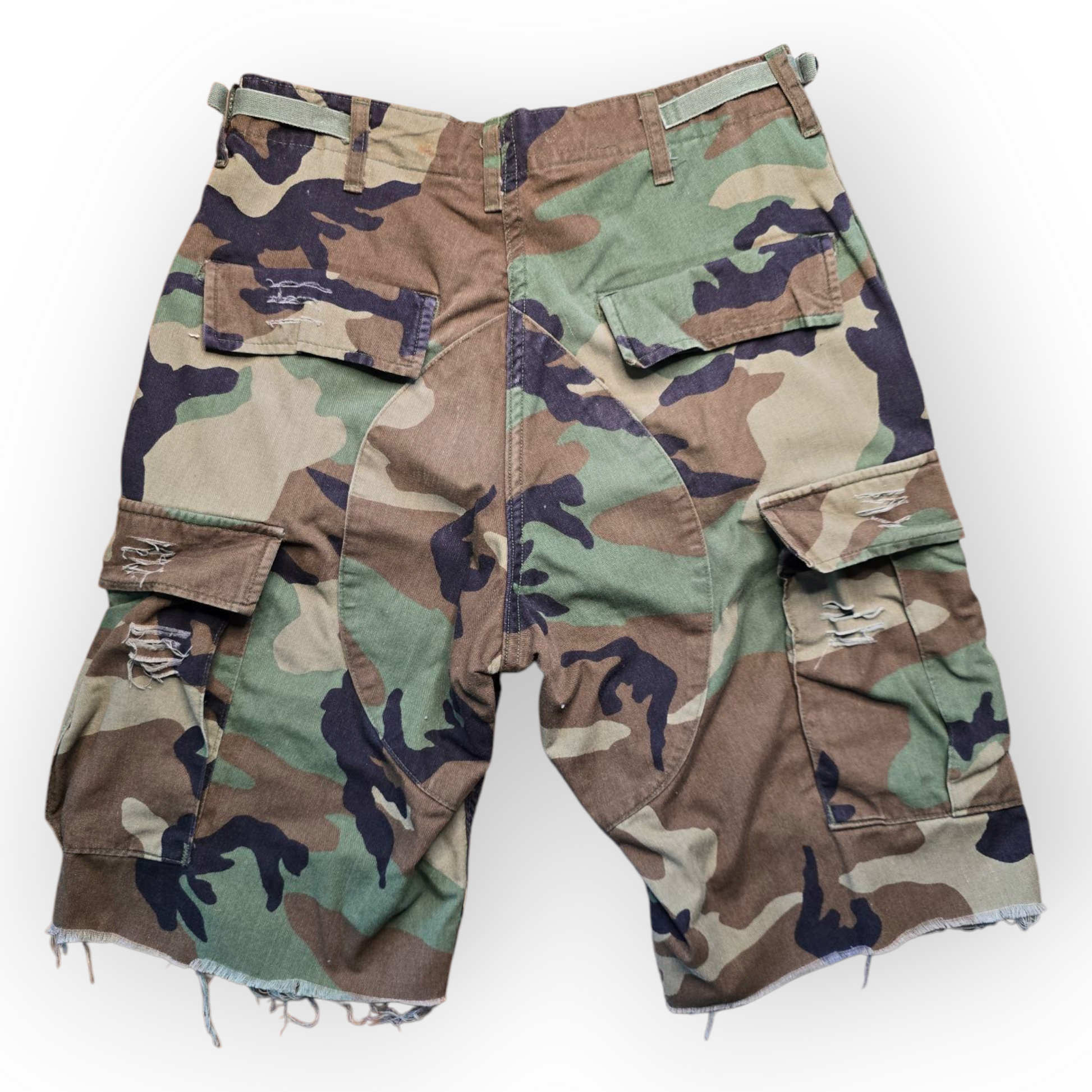 These Vintage Camo Shorts are truly one-of-a-kind. Each pair is hand weathered and crafted from authentic military fatigue. Dress them up or down for a unique and stylish look. No two are alike, making them a must-have for any fashion-forward individual. Add these to your wardrobe for an extra touch of vintage flair.