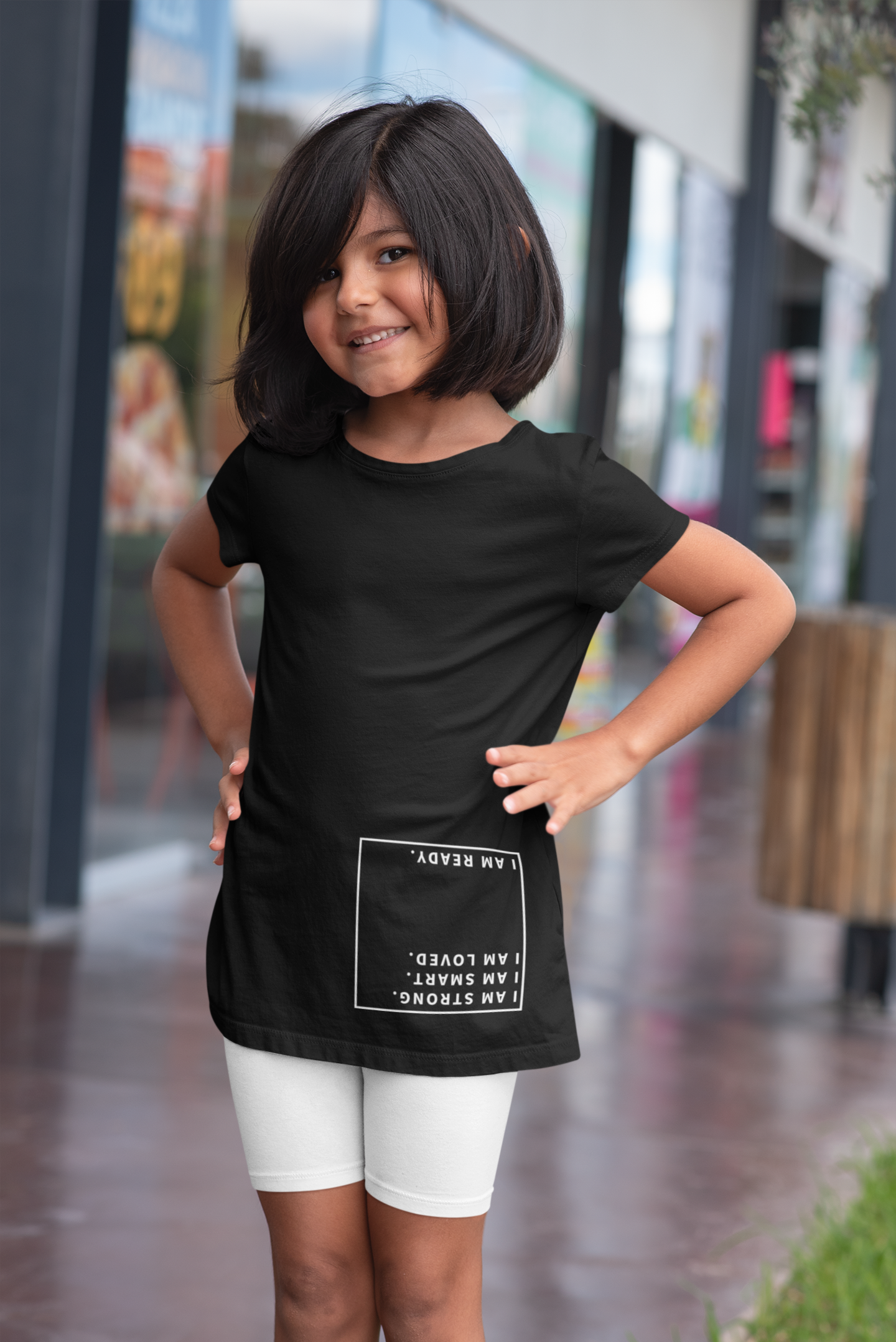 The affirmations on this tee are printed upside down so that kids can read them while wearing the tee and affirm themselves throughout the day! It's important to teach kids how to change their self-talk to positive statements and avoid "stinkin' thinkin'". When kids repeat these affirmations over and over again, they are less likely to define themselves based on their negative self-talk. Available in black and white.