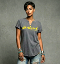 Stylish and comfortable, our new side slit tees come in retro colors that take you back to those summer day block parties! Side slits and ripped at the neck for added comfort. Available in three colors (gray with gold flocked logo, yellow with chocolate flocked logo, and terracotta with blue logo)