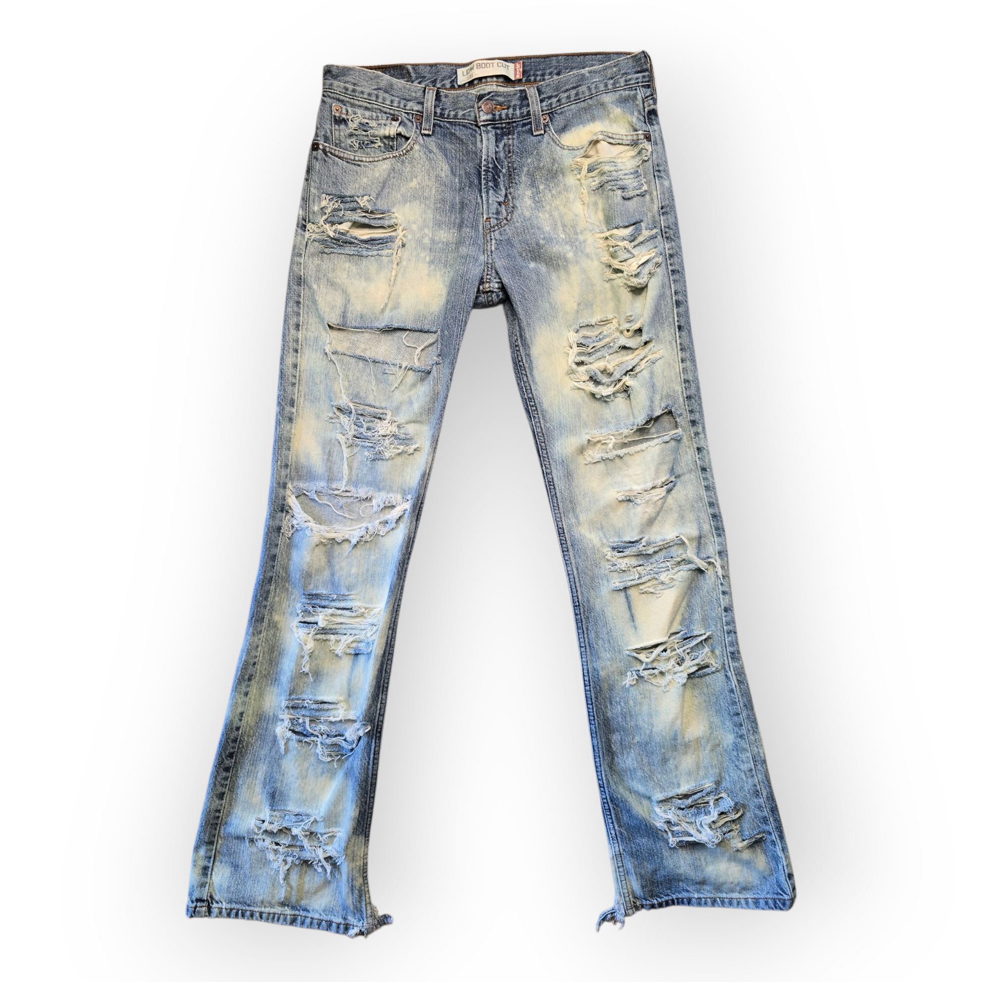 Features: Intentionally weathered (distressed and bleached), missing back pocket