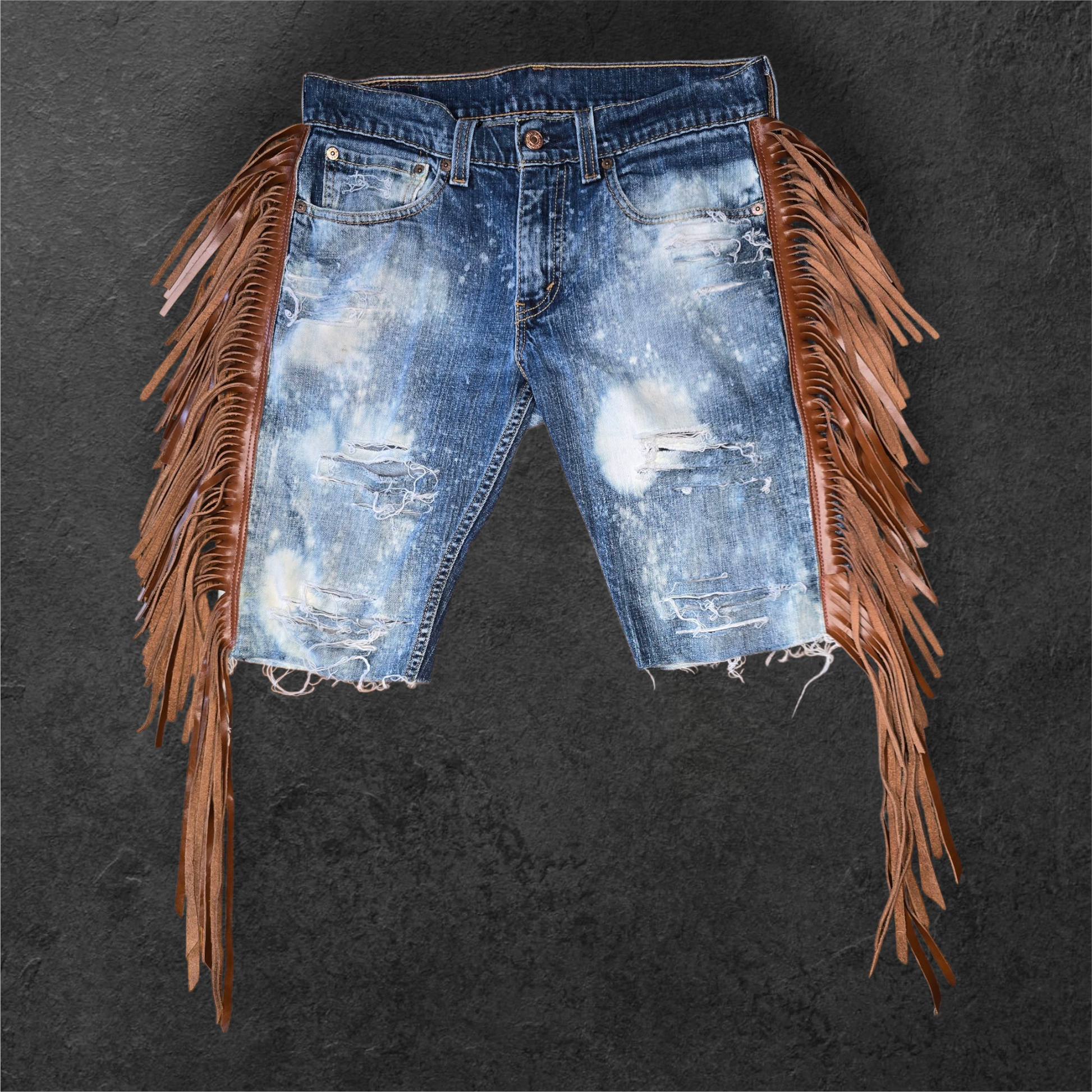 Features: Intentionally weathered (distressed and bleached), missing back pocket, 100% genuine medium brown leather fringe, knee-length shorts