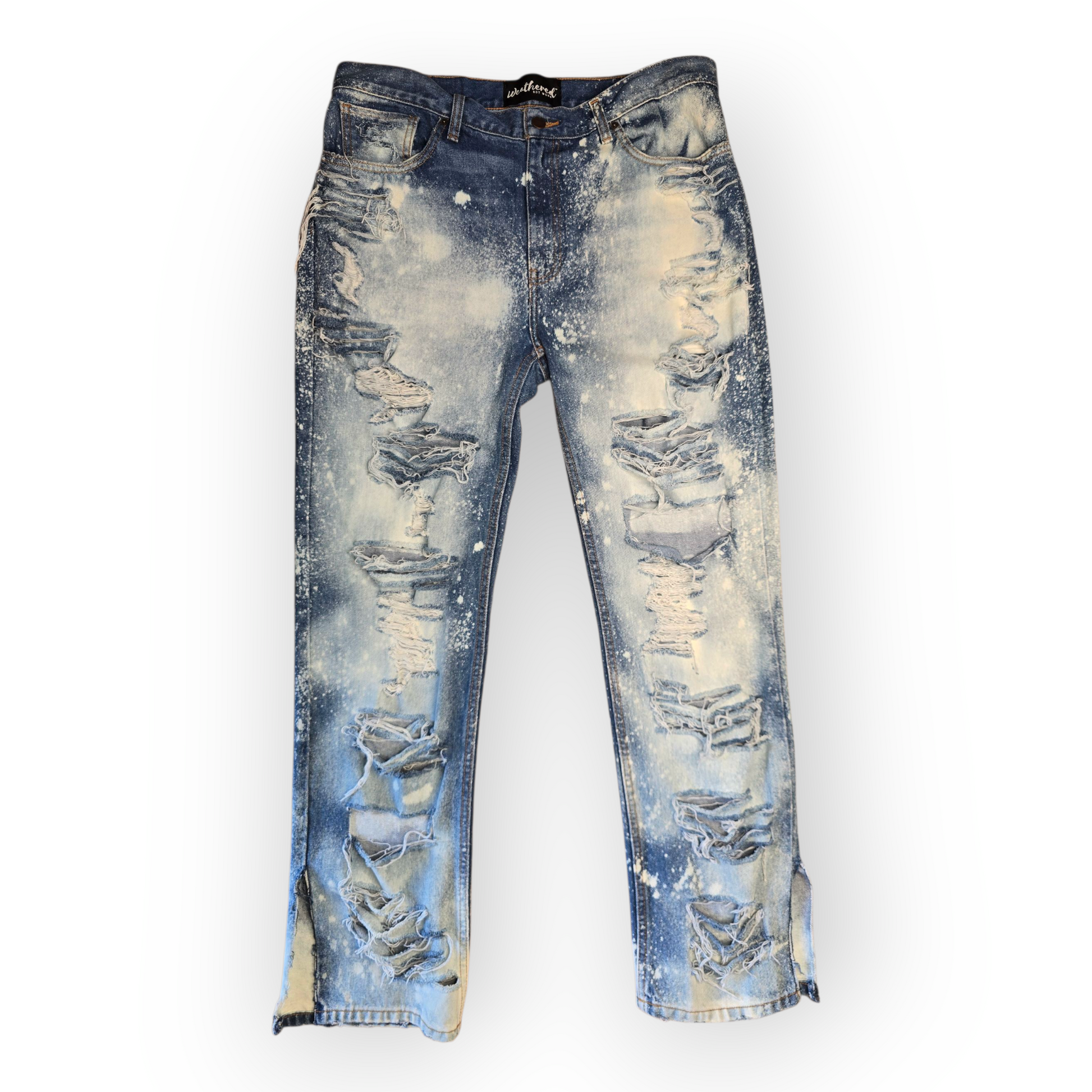 Features: Intentionally weathered (distressed and bleached), missing back pocket, side slit