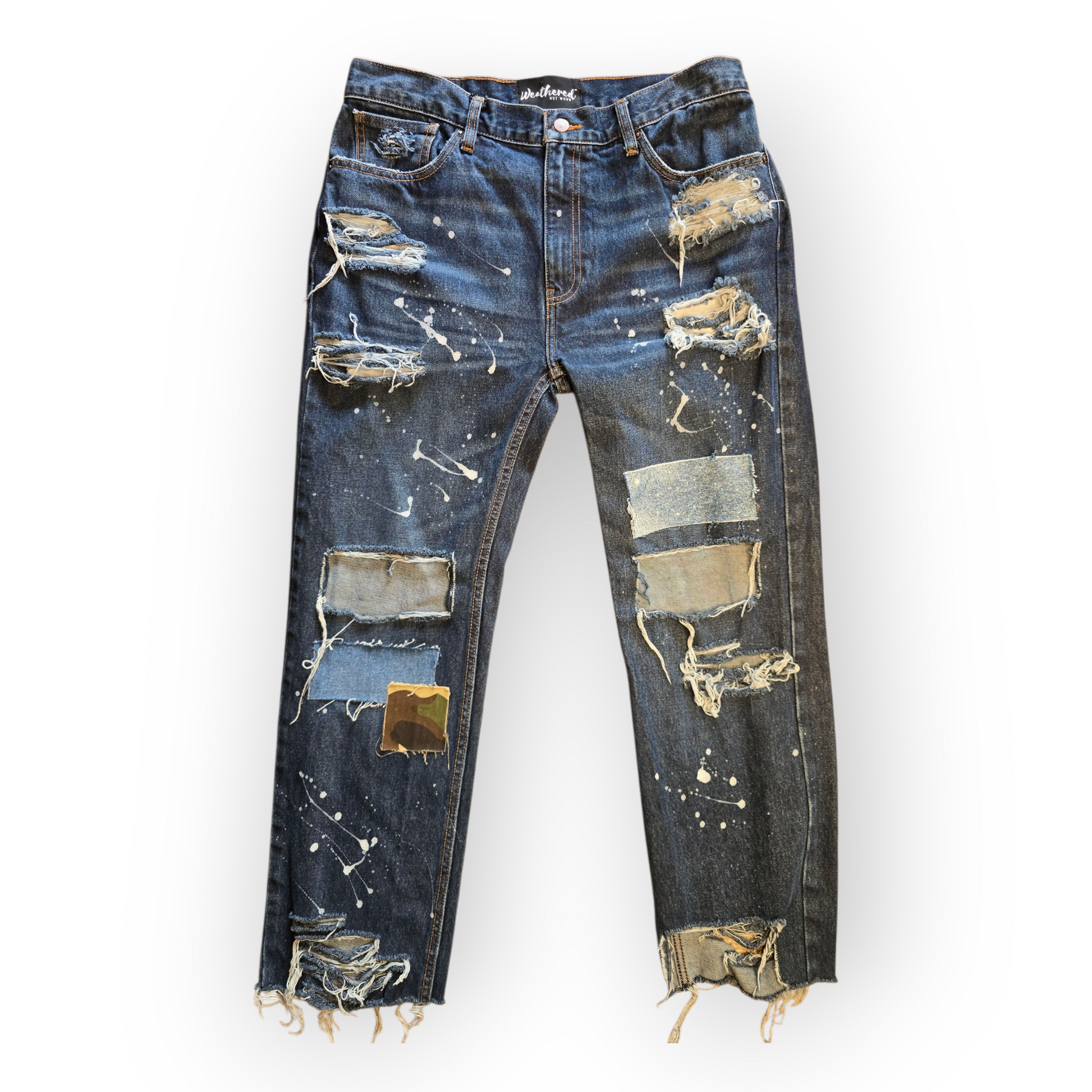 Features: Intentionally weathered (distressed and bleached), missing back pocket, paint splatters, patchwork