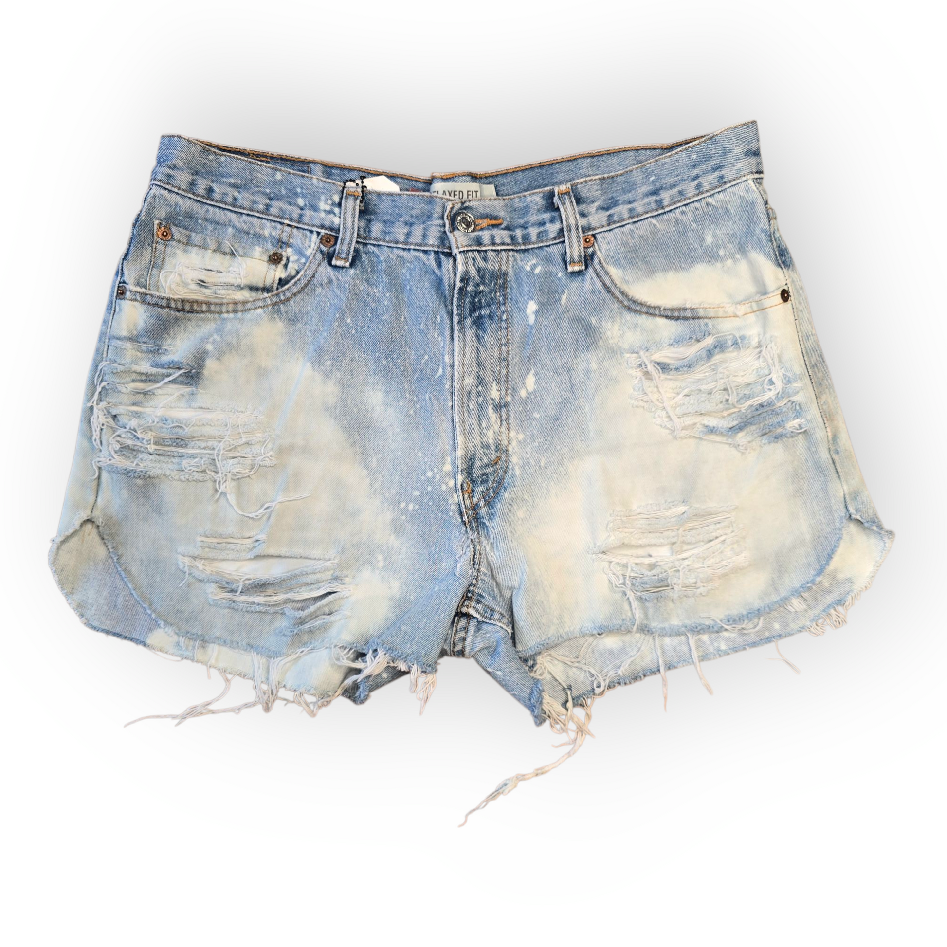 Features: Intentionally weathered (distressed and bleached), missing back pocket