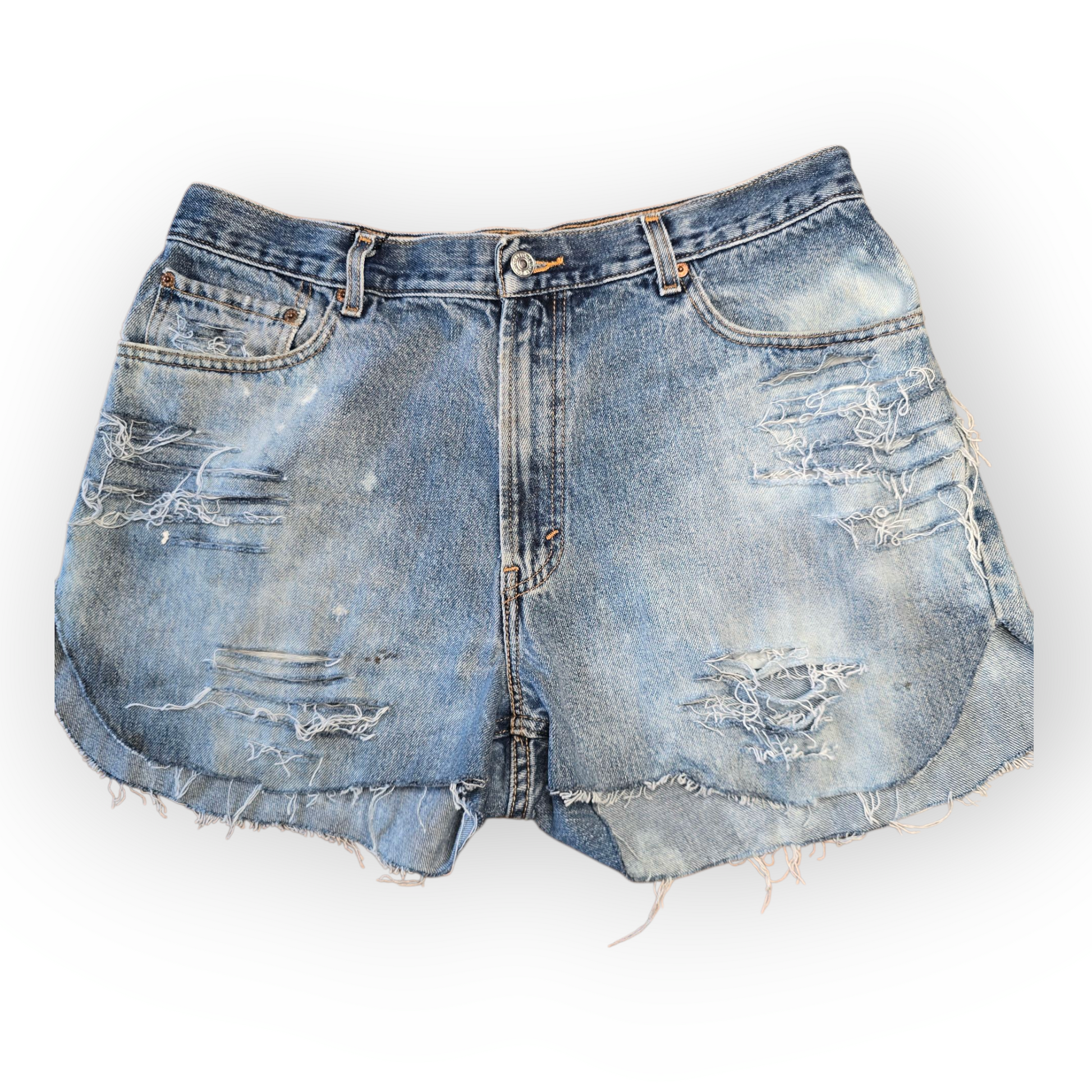 Features: Intentionally weathered (distressed and bleached), missing back pocket, natural staining
