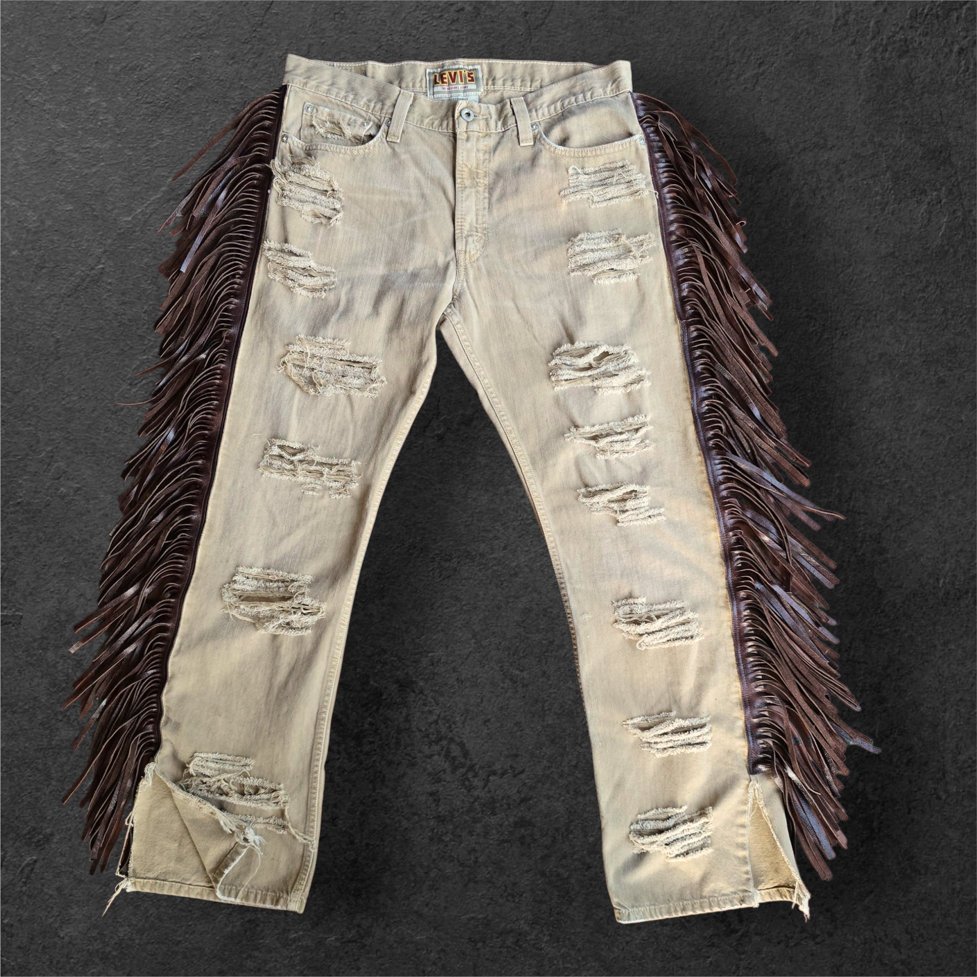 Features: Intentionally weathered (distressed and bleached), missing back pocket, 100% genuine dark brown leather fringe, full length faded light brown jean
