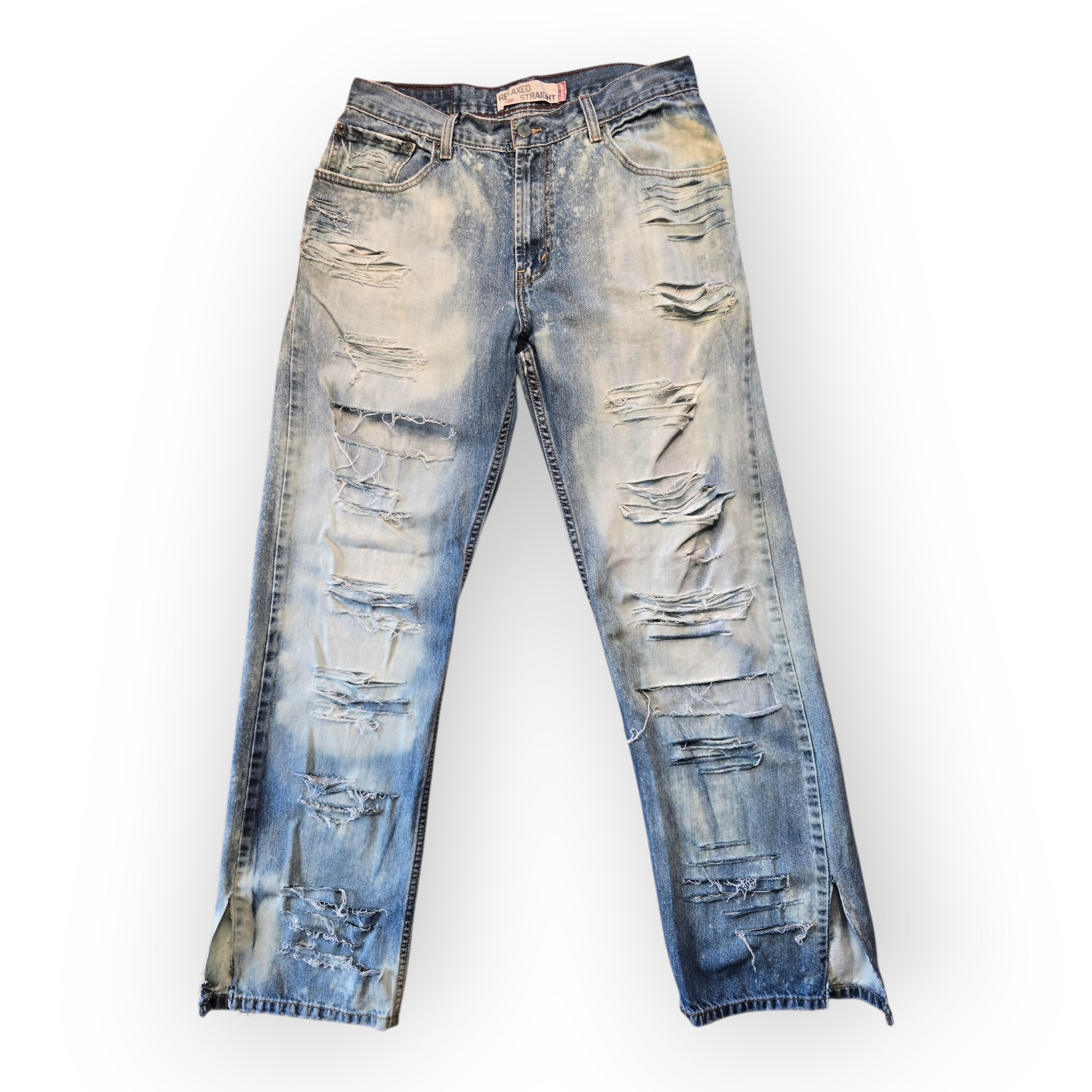 Features: Intentionally weathered (distressed and bleached), missing back pocket, side slit